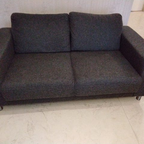 Beige kangasverhoiltu sohva, jossa näkyy kulumaa ja pieniä vaurioita kankaassa. Koiratalous. Nouto Halssilasta.