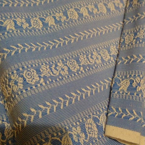 Vaaleaa kaunista kangasta, jota olen käyttänyt pöytäliinana. Pituus n. 167cm, leveys n. 121cm. En osaa sanoa, mitä materiaalia tämä on, mutta yritin ottaa kuvan sitä selventääkseni :)