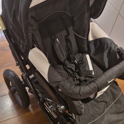 Rattaissa on ilmatäytteiset renkaat. Eturenkaat kääntyvät, mutta saa myös lukittua klipsulla. Toisen eturenkaan sisäkumi vaihdettu. Siistissä kunnossa olevat rattaat suuria kulumisen jälkiä ei näy. Säilytetty sisällä.