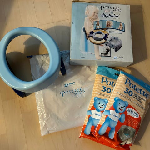 Potty Plus lasten matkapotta 2-in-1. Toimii erillisenä pottana, jolloin potassa käytetään biohajoavia pusseja tai sitten pöntönsupistajana, jolloin taapero voi käyttää normaalia pönttöä. Mukaan tulee 10kpl vaihtopusseja. Tätä mallia on myynnissä mm. Lastenturvassa, josta voi ostaa myös lisäpusseja. Kätevä ja kevyt matkoilla: mahtuu huomaamattomasti mukaan esim. rattaiden koriin ja rengas menee korkeuden puolesta hyvin matkalaukkuunkin. Oli meillä mukana autolomalla ja helpotti kyllä kulkemista. Siistissä kunnossa. Postitus Toridiilinä.