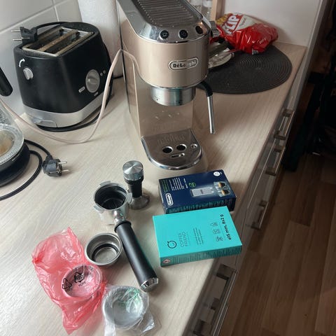 Hyväkuntoinen Delonghi ec685 espresso kone seuraavaan kotiin. Kalkinpoisto tehty viimeisen päälle, ulkoa hyväkuntoinen. Testattu toimivaksi, sekä maidonvaahdotus että kahvin teko. Mukaan alkuperäinen portafiltteri ja kuvassa näkyvät oheistuotteet.