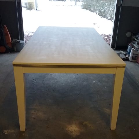 Valkoinen ruokapöytä. Jalat ovat irrotettavat, joten pöytä on helppo kuljettaa. Pinnassa näkyy hieman värin kulumaa (näkyy kuvissa) mutta pöytä on muuten tukeva ja täysin käyttökelpoinen.
