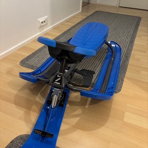 Stiga Snowracer pulkka musta ja oranssi. Pulkassa on ohjattava eturengas, jarrut ja istuin. Sopii talviaktiviteetteihin lumessa.