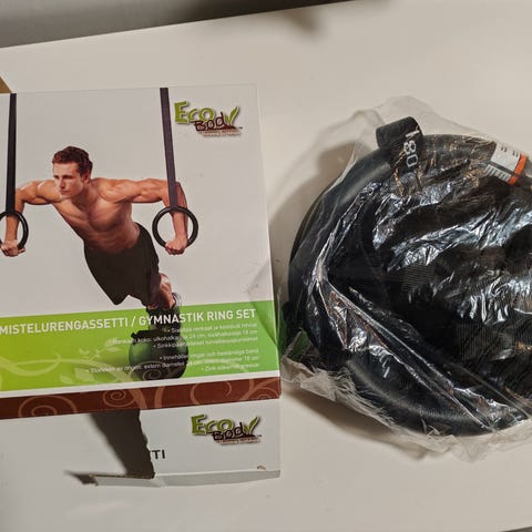 Suomen voimistelutuotteen voimistelurenkaat. Lasten koko. Mustat nauhat. Kattokoukut.