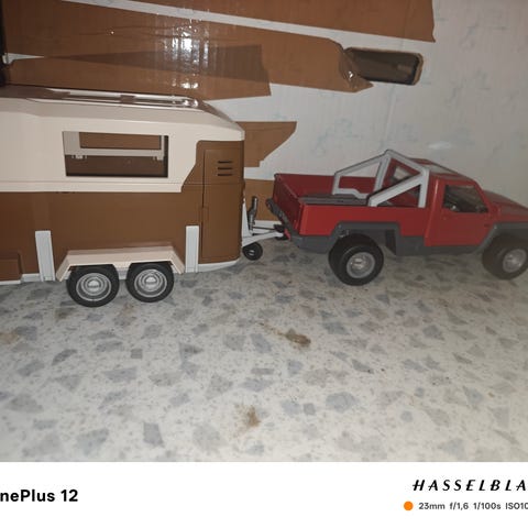 Myydään settinä kuvan mukainen kokonaisuus, jossa auto + kuski, traileri (lisävarusteina toinen katto + takasilta), varsa, loimi sekä pesupaikka (koostuu neljästä osasta).