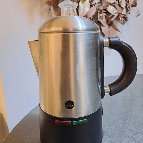 Toimiva 1 litran perkolaattori. Pientä ajan tuomaa kulumaa havaittavissa. Pieni lommo alanurkassa, näkyy kuvasta.