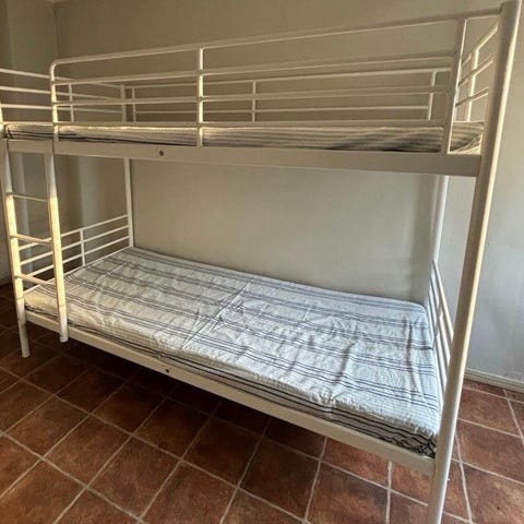 IKEA kerrossänky, jossa valkoinen metallirunko. Sänky koostuu kahdesta tasosta, joissa metallikehikot patjoille. Soveltuu tilan säästämiseen ja kahden henkilön nukkumiseen.
