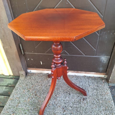 Valkoinen antiikkinen pilarijalkapöytä. Pöydän pinnassa hieman käytön jälkiä. Pöytä on täyttä puuta, joten voi halutessaan hioa ja maalata.