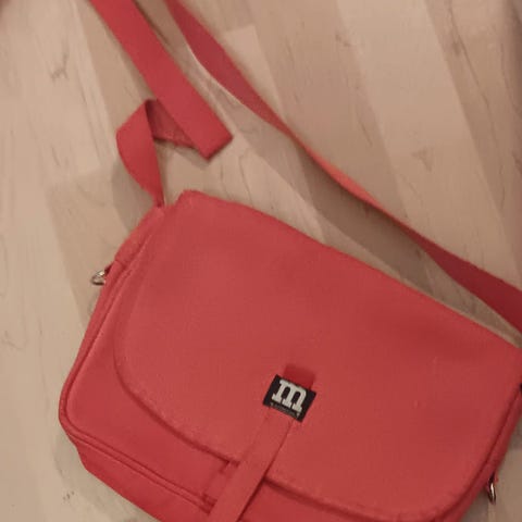 Marimekon punainen olkalaukku. Laukussa on säädettävä olkahihna ja useita taskuja, mukaan lukien vetoketjutasku. Materiaalina on kestävä kangas.