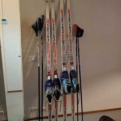 Fischer skate luistelusukset ja sauvat lapselle. Kahden lapsen satunnaisesti hiihtämät. Kanta vähän irvistää (kuva), muttei haittaa menoa. Pohjat siistit.