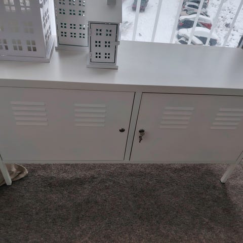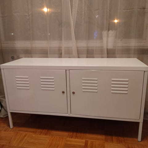 IKEAn punainen PS-kaappi. Sisällä molemmin puolin johtojen reiät ja välihyllyt. Saa tarjota hintaa!