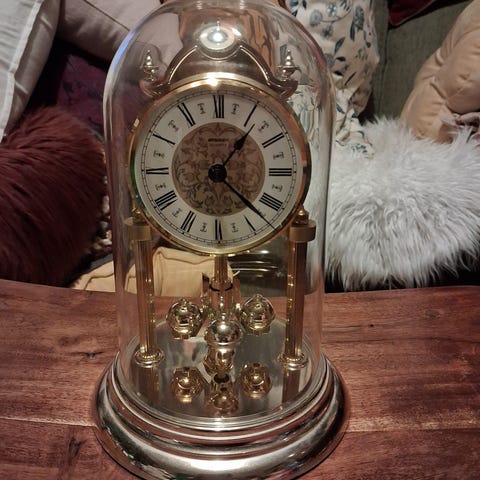 Pattereilla toimiva pöytäkello. Pysyy ajassa. Korkeus 29 cm. Alaosassa pari pintanaarmua.