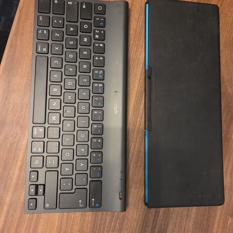 Myydään iPad Air 2 yhteen sopiva näppäimistö. Huomaa että yksi kulma on ”revennyt” (näkee kuvasta). Se on muovia. En ole kokeillut mutta varmaan pikaliimalla saisi takaisin kiinni.