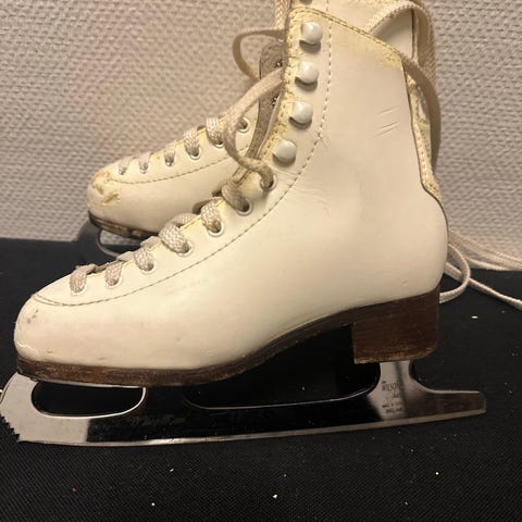 Wifa lasten luistimet, koko 34. Luistimissa on valkoinen nahkainen päällinen ja metalliset terät. Käytetyt laadukkaat taitoluistimet.