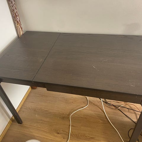 Kovalla käytöllä ollut pöytä, ikea Torsby, 4 hengen pöytä. Ehjä ja toimiva. Pintalevy kulunut. Pöytä on purettu osiin valmiiksi kuljetusta varten.