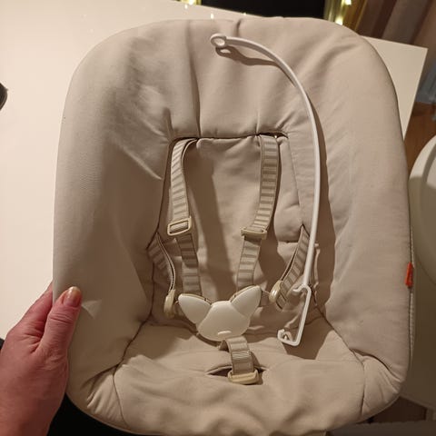 Hyväkuntoinen Stokken tripp trapp tuoliin kuuluva lisäosa vastasyntyneille. Pesty hajusteettomalla pesuaineella. Meillä ei ole lemmikkejä tai tupakointia. "The Newborn Set offers a soft, cozy space with a supportive harness, ensuring safety and comfort for your baby."