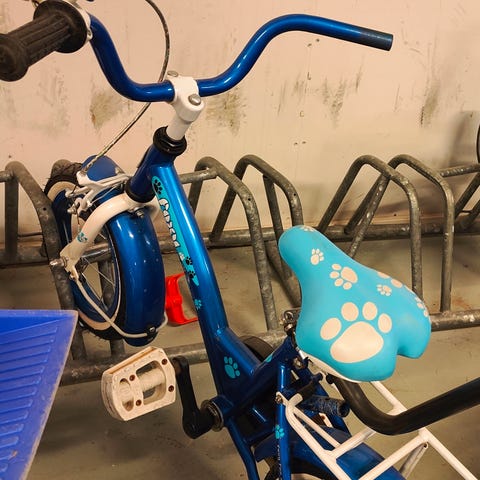 Lasten polkupyörä, sininen, 12 tuuman renkailla ja apupyörillä. Sopii pienille lapsille pyöräilyn harjoitteluun.