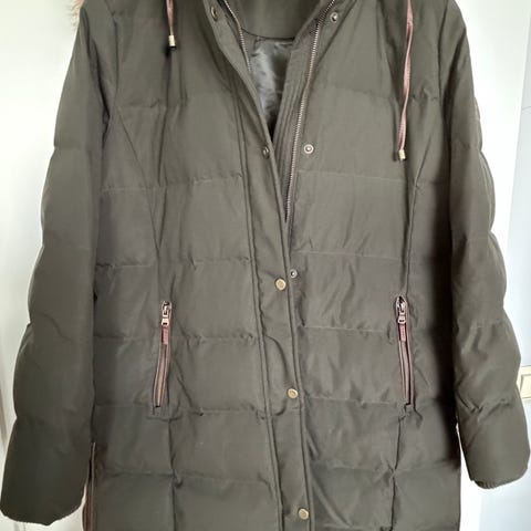 Pitkä beige untuvatakki. Täyte untuvaa ja höyhentä. Tosi hyvässä kunnossa, käytetty harvakseltaan yhtenä talvena. Irroitettava karva hupussa.