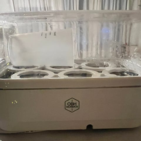OBH Nordica munankeitin valkoisella värillä. Laite on suunniteltu keittämään munia tasaisesti ja siinä on mittakuppi veden annostelua varten.