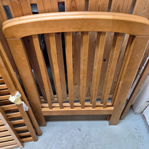 Kunto: kohtalainen. Sängyn pohjapalassa sivulla halkeama (korjattu kestävällä liimalla ja ruuvilla) Muuten sänkyn sivut on suhteellisen siistit paitsi toisen päätypalan päällä maalikulumaa