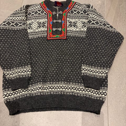 Ihana retro norjalaisvillapaita. Norwool -merkkinen, koko XL, 100% villaa. Paita on harmaa ja valkoinen, jossa on koristeellinen kirjailu kaula-aukon ympärillä ja metalliset hakaset edessä.