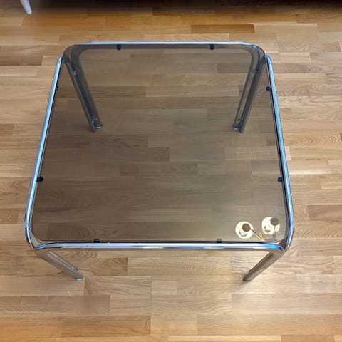 Siisti musta lasinen sivupöytä, tempered glass. Pupunkorvat joihin voi laittaa johdot kiinni niin voin ostajan halutessa ottaa pois.