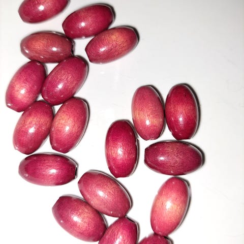 Iso pitkulainen punertava puuhelmiä 7 kpl. Löytyy vain tämä yksi setti. Koko noin 16x27 mm. Soveltuu askarteluun ja vaatteiden koristeluun. Materiaali puuta. Melko isoja. Pujoitusreikä noin 4mm.