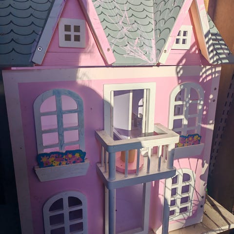 Annetaan puinen, puusepän tekemä nuken sänky. Pohja irronnut osittain, helppo korjata.