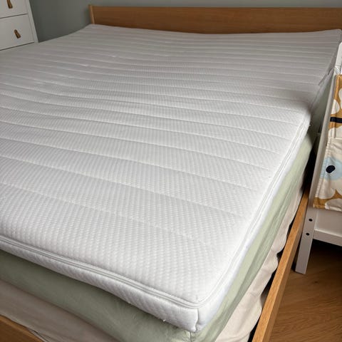 Jysk patja, jossa on toisella puolen medium-kovuus, toisella hard. Vaalea pehmeä päälikangas.