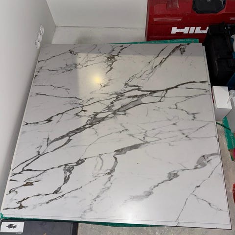 Laatta, jossa valkoinen pohjaväri ja harmaat marmorikuvioinnit. Esim. pöytälevyksi.