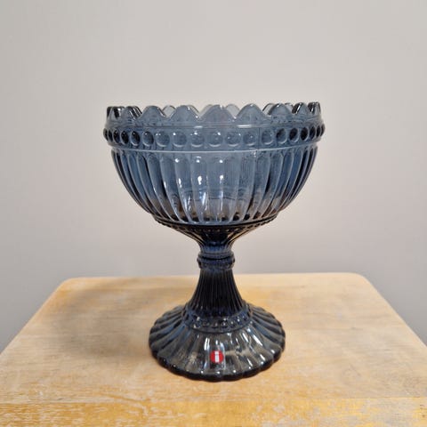 mariskooli, maribowl, marimekko, iittala, iittalan lasi, designlasi, suomalainen design, keräily, keräilyesine, tarjoilumalja, tarjoilukulho, karkkimalja, jalallinen malja, lasimalja, tummanharmaa, dark grey, harmaa, sisustus, kattaus, skandinaavinen, vintage-henkinen, made in finland, iittala tarra, 155mm, 15,5cm