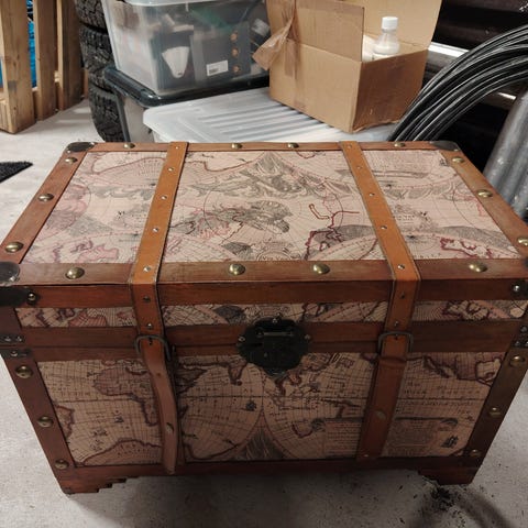 Entisajan pieni arkku moniin tarkoituksiin. Väriltään muistuttaa myös myynnissä olevaa isoa kirstua. Päissä pienet nostorenkaat.