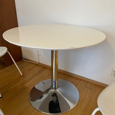 Pyöreä valkoinen ruokapöytä. Halkaisija 100 cm ja korkeus 75 cm. Kunto kohtalainen. Päälipinnassa useita pieniä iskuja, joita voi zoomailla kuvista.