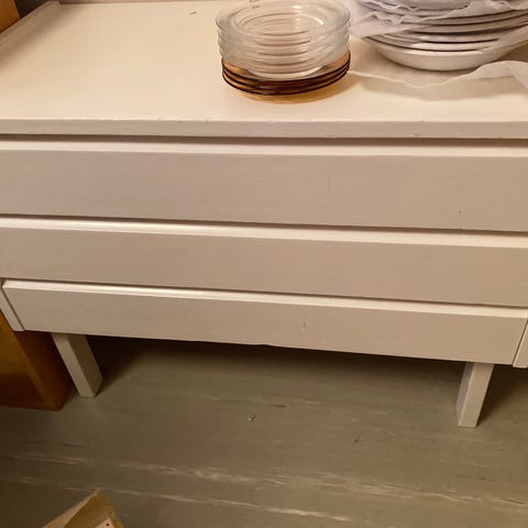 Valkoinen lipasto. Hyvä kunto. Kannessa pieni jälki.