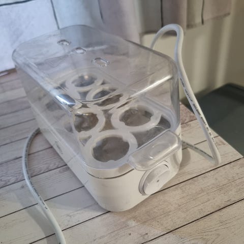 Laitteessa on mukana mittakuppi veden annostelua varten.