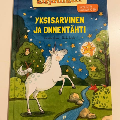 Yksisarvinen ja onnentähti kovakantinen tavutettu lastenkirja.