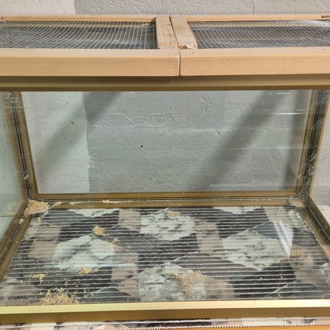 80x40x40 terraario, en pese mutta pyyhin sisältä. Nyt vain tyhjennetty puruista. Lasit ehjät, ei pidä vettä tod.näk.