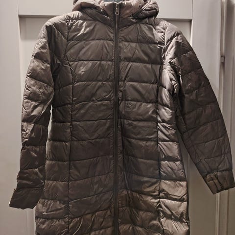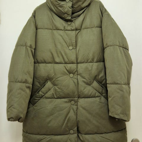 Hyväkuntoinen toppatakki, kokolappu poissa, mutta ehkä L/XL, väriltään havunvihreä.