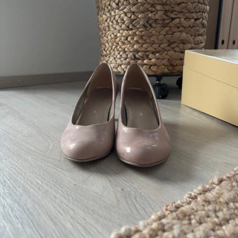 korkokengät, koko 39, musta väri. Kengät ovat tekonahkaa. Malli on klassinen korkokenkä, jossa on keskikorkea korko. Korosta pinnoite on kulunut.