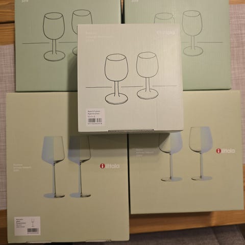 Iittala lasiset juomalasit verna viinilaisit ja essence karahvi harmaana ja lasit vihreässä värissä, mukana tulee myös kaksi matalaa lasia jotka ovat kaj franck in suunnittelemat.