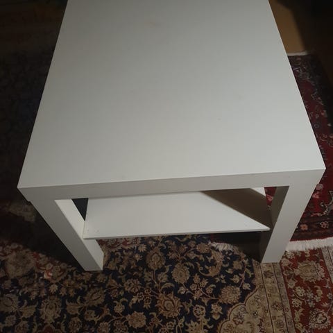 Valkoinen sohvapöytä, puunvärisillä jaloilla ja laatikolla. Muuten hyväkuntoinen, mutta muutamassa jalassa koiran hampaiden jälkiä (ei huomaa käytössä).