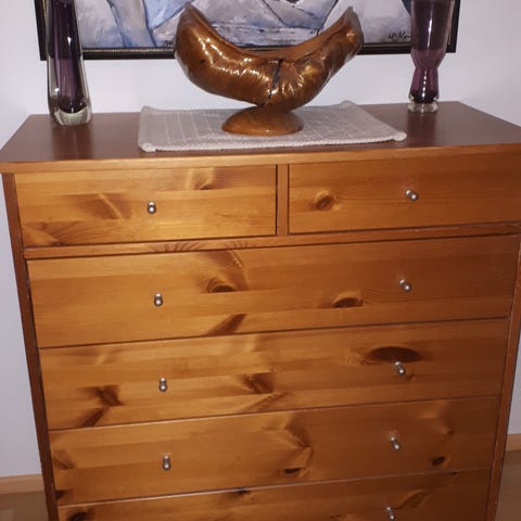 Tumman ruskea lipasto lasiovella ja laatikoilla