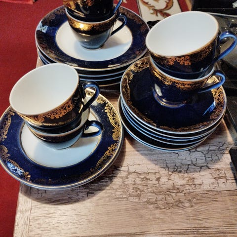 Hyväkuntoisia, kupeista kahdesta on pieni pala molemmista lähtenyt. Yhdessä lautasessa on pieni kuluma nurkassa.