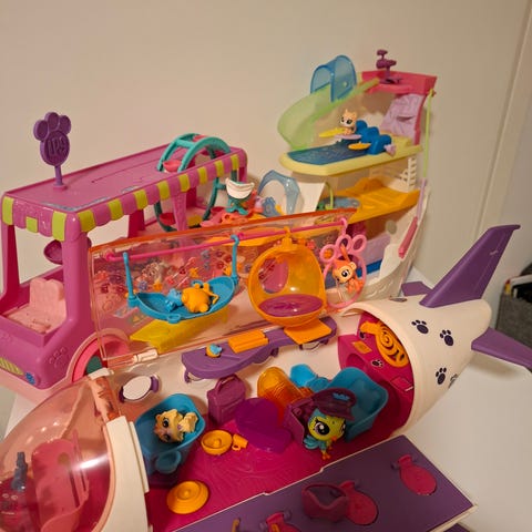 LPS lentokone ja 8 hahmoa. Lentokoneessa käytön jälkiä, ainakin yksi ikkunasuojus hukassa. Toridiili tai nouto Kokemäki.