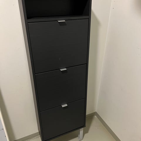 Kenkäkaappi.Siisti, valkoinen korkeakiilto kenkäkaappi jossa hopeanväriset vetimet.