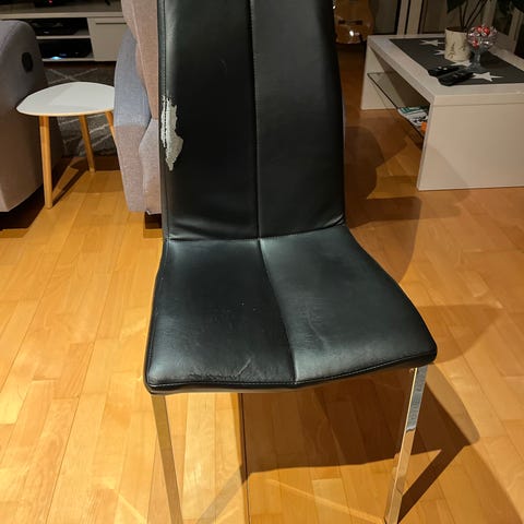 Annetaan Jyskistä v. 2017 ostettu korkeakiiltoinen, hyväkuntoinen ruokapöytä ja siihen kuuluvat kuusi tekonahkatuolia. Tuolien tekonahka on jo parhaat päivänsä nähnyt ja joistain kohdista repeilevä, kts. kuvat.