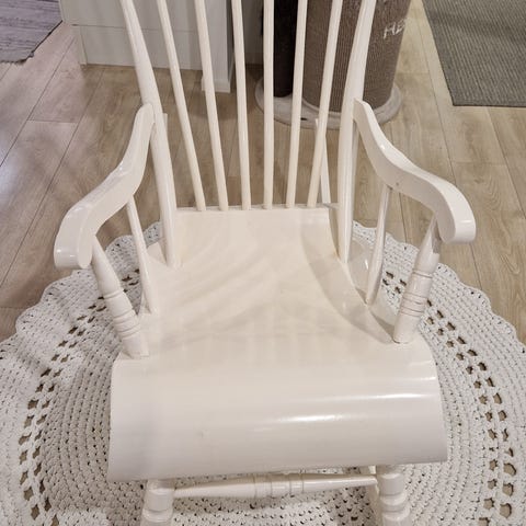 Hieman tavanomaista pienempi kokoinen valkoinen keinutuoli. Kaikki mitat noin mittoja, istuinkorkeus 48cm, käsinojien väli 44-48cm. Mainiossa kunnossa, kaikki puuosat tukevasti kiinni. Aikoinaan kalustemaalaamossa maalattu. Maalipinnassa paikoin kulumaa, erityisesti jalkojen alla. Vain nouto.