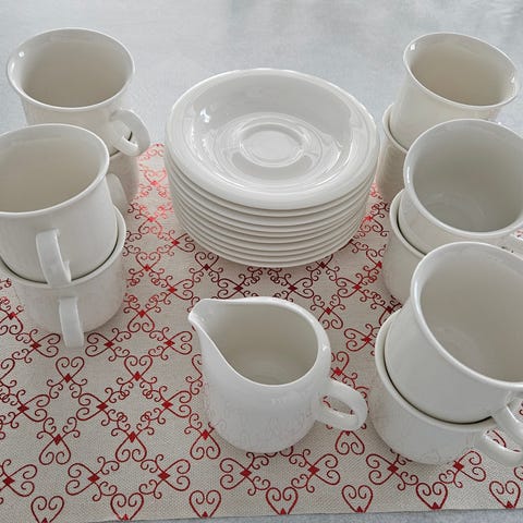 Uudet paketeissa olevat kahvikupit 4kpl ja kermakko.