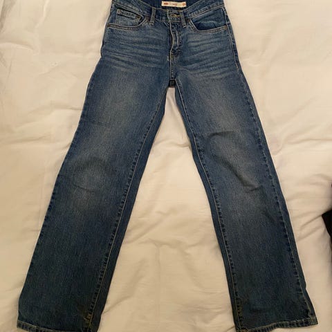 Levi's denimfarkut tytöille, koko 146. Farkut ovat sinisen väriset ja valmistettu denim-materiaalista.