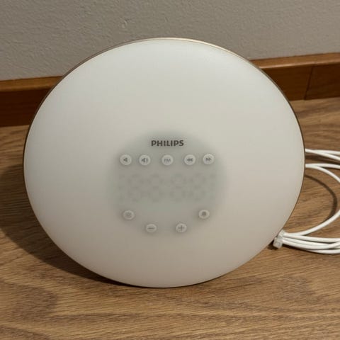 Philips Wake-Up Light herätyskello valkoisella värillä. Laite toimii herätyskellona, joka simuloi auringonnousua valolla herättääkseen käyttäjän luonnollisesti. Sisältää useita valon ja äänen asetuksia, jotka tukevat heräämistä pimeinä vuodenaikoina.